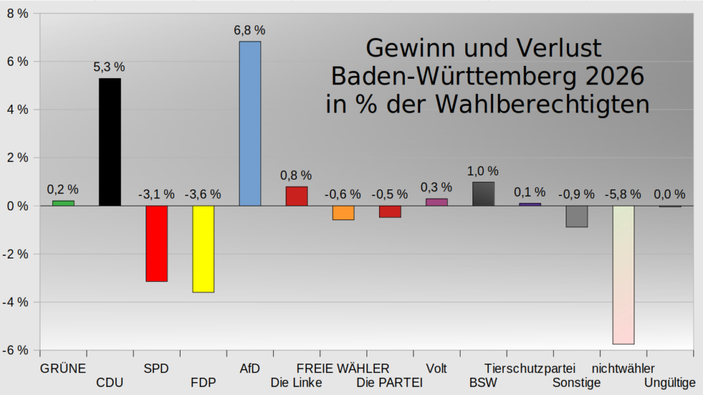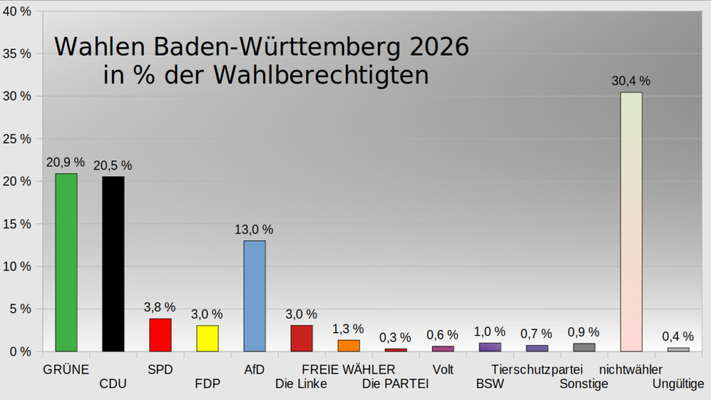Weiteres Thema die Ergebnisse der Landtagswahl in Baden-Württemberg 2026 in % der Wahlberechtigen.